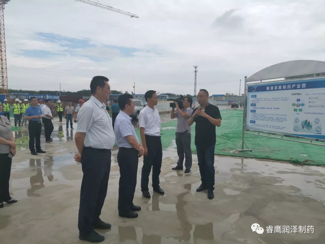 2019年8月7日下午14時許,山東省人大常委會副主任于曉明,菏澤市委書記張新文一行,在菏澤市委副書記鄄城縣委書記張倫的陪同下,到鄄城睿鷹制藥產業園項目建設現場進行調研。睿鷹制藥集團董事局主席彭繼先,鄄城睿鷹制藥產業園項目建設負責人王世安、葛新芳、高博熱情接待。彭總就鄄城睿鷹制藥產業園項目的整體情況進行了匯報。鄄城睿鷹制藥產業園是國內首家采用智能制造工業4.0標準進行建設、運營和管理的高端醫藥產業園。園區率先建立了國家級科創中心,以科創中心平臺為支撐,匯聚全球之智,實現研發在全球,孵化在鄄城!以科創中心孵化為引領,以睿鷹集團的十大產業板塊為支撐,創建了十大共享平臺,建立了共享經濟平臺新業態。通過股權合作、合伙人、CDMO定制等合作運營模式,為園區發展注入了新的活力,實現資源在全球,產業在鄄城的目標!睿鷹制藥集團致力于把鄄城睿鷹制藥產業園打造成為21世紀國內智能制造醫藥行業的標桿,帶動菏澤醫藥行業高速發展。
