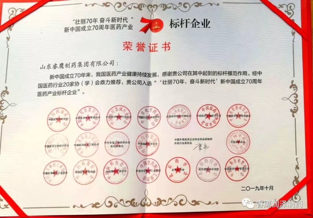 據(jù)悉,“壯麗70年,奮斗新時(shí)代”新中國成立70周年“醫(yī)藥產(chǎn)業(yè)標(biāo)桿企業(yè)”評選活動(dòng),是由中國醫(yī)藥行業(yè)20家協(xié)(學(xué))會(huì)共同開展的。活動(dòng)自2019年5月啟動(dòng)以來,歷時(shí)4個(gè)多月,在推薦的近500家資深醫(yī)藥企業(yè)中,綜合評估各企業(yè)在貢獻(xiàn)度、創(chuàng)新度和影響度等各方面指標(biāo),最終產(chǎn)生100家標(biāo)桿醫(yī)藥企業(yè)。山東睿鷹制藥集團(tuán)憑借在科技創(chuàng)新、行業(yè)引領(lǐng)、平臺(tái)搭建及智慧化全產(chǎn)業(yè)鏈建設(shè)等方面取得的成就脫穎而出,榮譽(yù)入選“醫(yī)藥產(chǎn)業(yè)標(biāo)桿企業(yè)”。