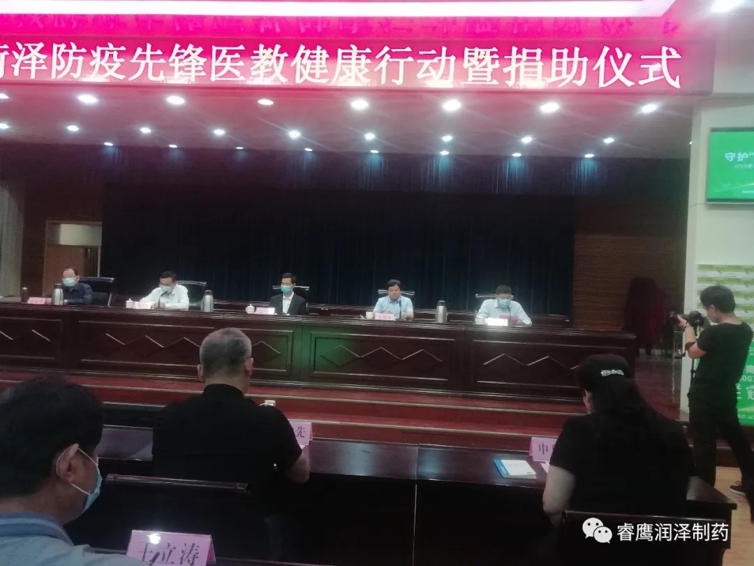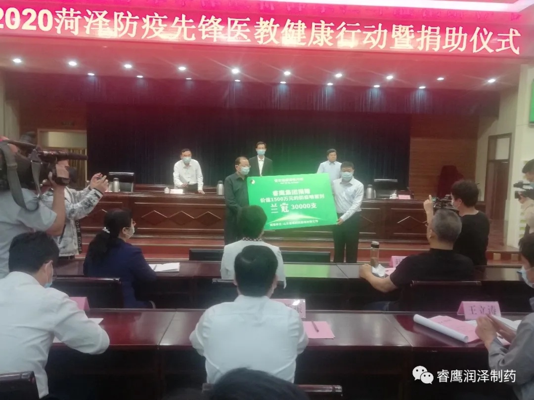 5月15日,由“守護‘醫’線·守護校園”——2020菏澤防疫先鋒醫教健康行動”在菏澤市政府第四會議室舉行。山東睿鷹集團向菏澤防疫一線醫務人員和高中校醫、高三畢業班任課教師捐贈3萬支、價值1500萬元抗病毒噴劑(蘭冠)。菏澤市委副書記張倫出席儀式并致辭。市疫情防控指揮部和市有關部門單位負責同志,上海市公共衛生臨床中心專家徐建青教授、山東睿鷹制藥集團彭繼先及有關負責人,部分醫護、教師代表等參加此次公益捐助活動。