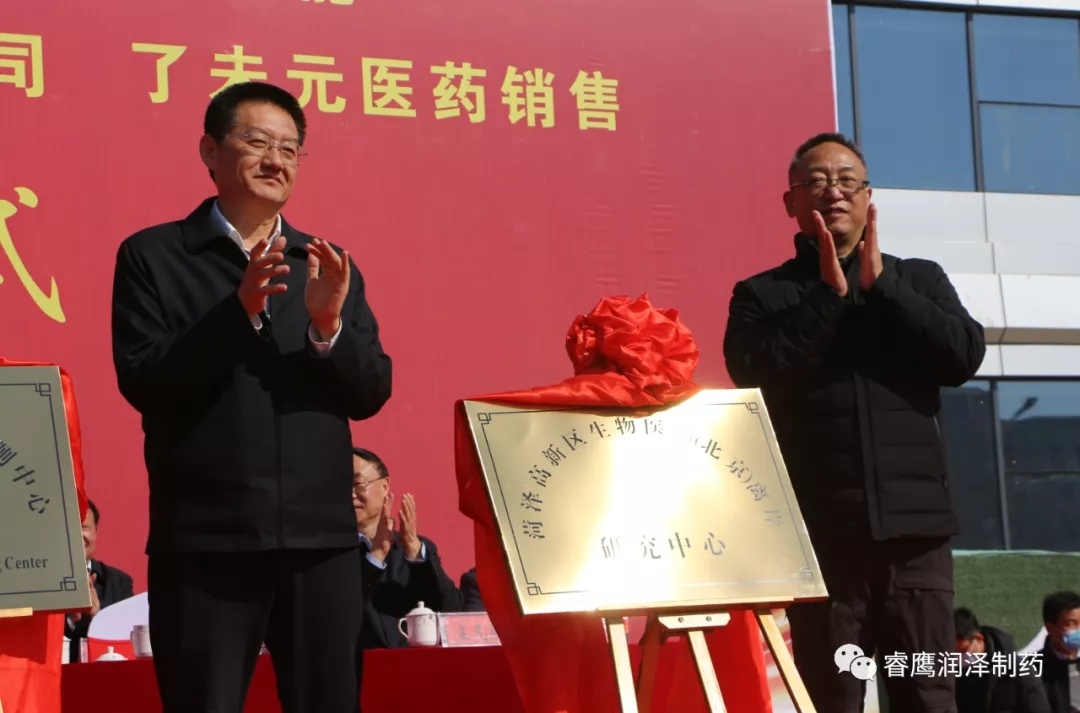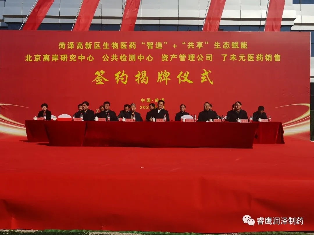 張新文書(shū)記與彭繼先總裁分別為菏澤高新區(qū)生物醫(yī)藥(北京)離岸研究中心、菏澤高新區(qū)醫(yī)藥公共檢測(cè)中心、山東海潤(rùn)資產(chǎn)管理有限公司、山東了未元醫(yī)藥銷(xiāo)售有限公司揭牌。