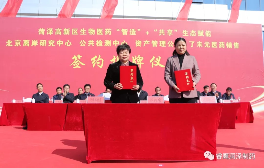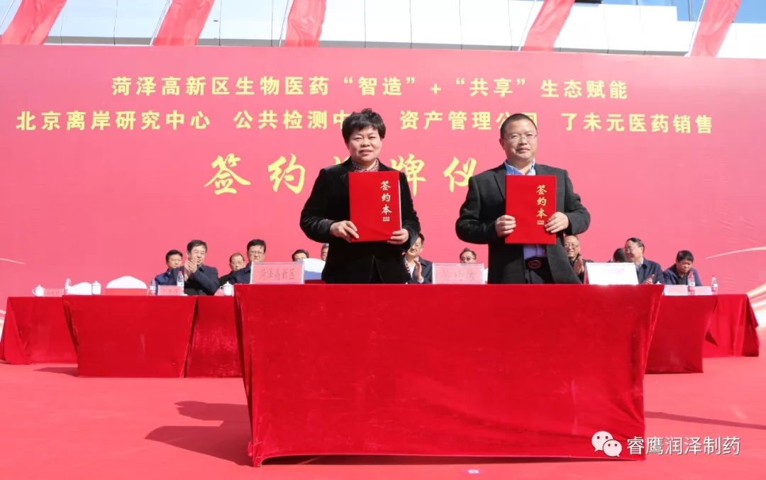 在儀式中,菏澤高新區(qū)黨工委副書(shū)記、管委會(huì)常務(wù)副主任馮艷麗分別與山東了未元醫(yī)藥銷(xiāo)售公司總經(jīng)理曾凡洪先生,山東海潤(rùn)資產(chǎn)運(yùn)營(yíng)管理有限公司總經(jīng)理龐艷玲女士簽約。