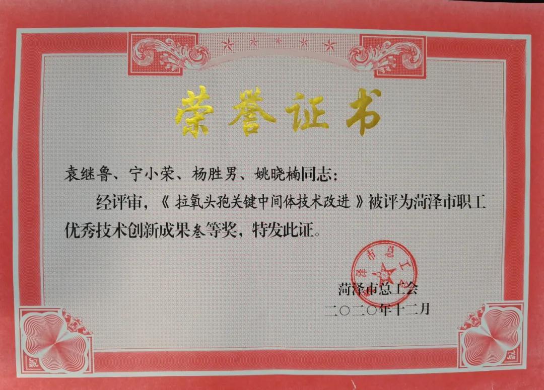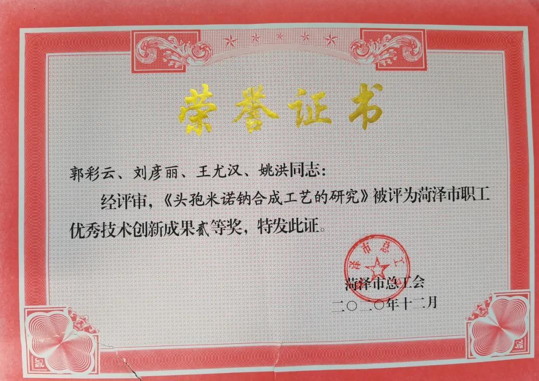 郭彩云、劉彥麗、王尤漢、姚洪所申報的《頭孢米諾鈉合成工藝的研究》榮獲菏澤市職工優秀技術創新成果二等獎,袁繼魯、寧小榮、楊勝男、姚曉楠所申報的《拉氧頭孢關鍵中間體技術改進》榮獲菏澤市職工優秀技術創新成果三等獎,在此對以上單位及職工表示祝賀,成果來之不易,榮譽來之不易,希望廣大睿鷹人戒驕戒躁,向榜樣學習,沉淀技術,不斷深耕,自我超越,精益求精,為睿鷹新征程做出突出貢獻!