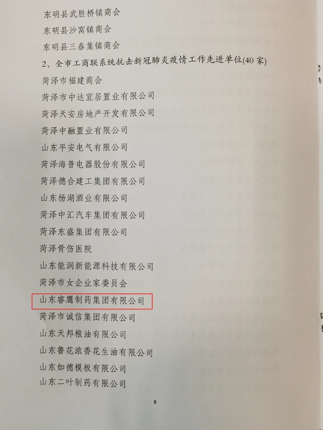 會上,為菏澤市工商聯(lián)系統(tǒng)抗擊新冠肺炎疫情工作先進單位頒發(fā)了獎杯與榮譽證書,山東睿鷹制藥集團獲此殊榮。