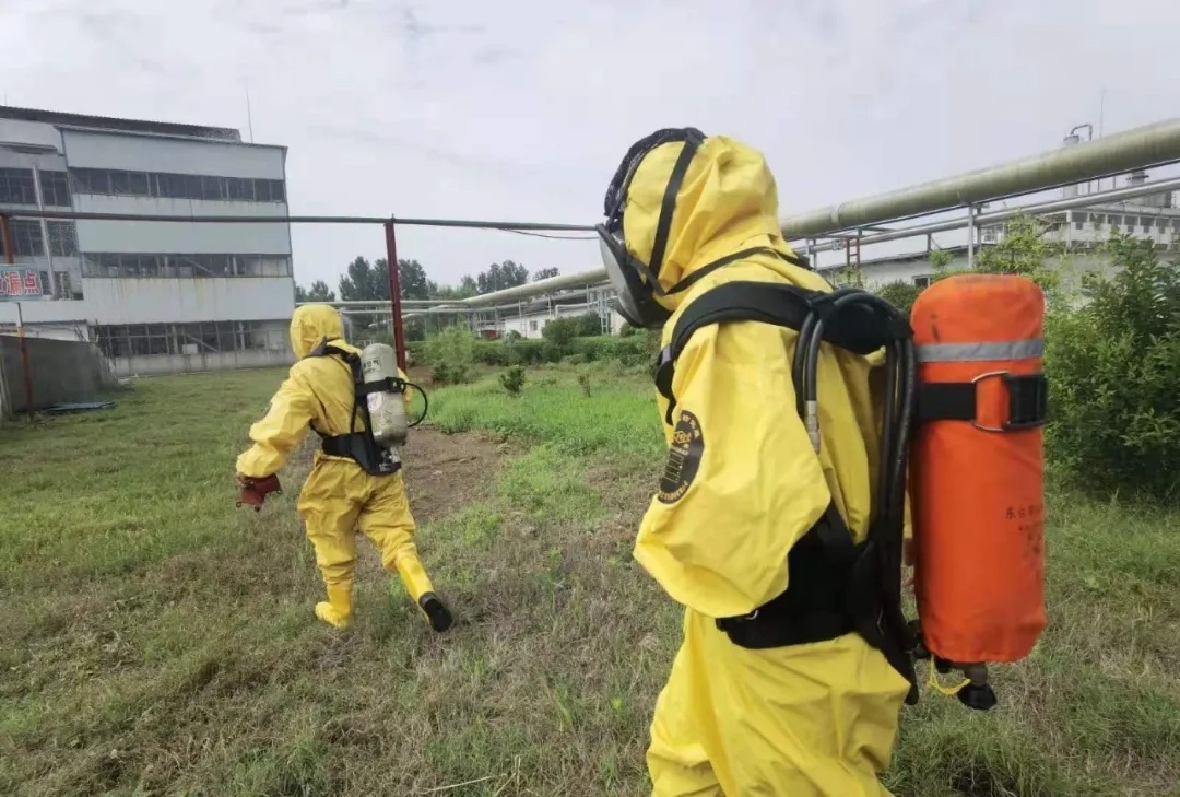 泄漏點控制完畢,指揮部命令環保處理組其中一隊員身穿防化服、配戴正壓式呼吸器,攜帶便攜式有毒氣體檢測器進行現場環境大氣污染監測;