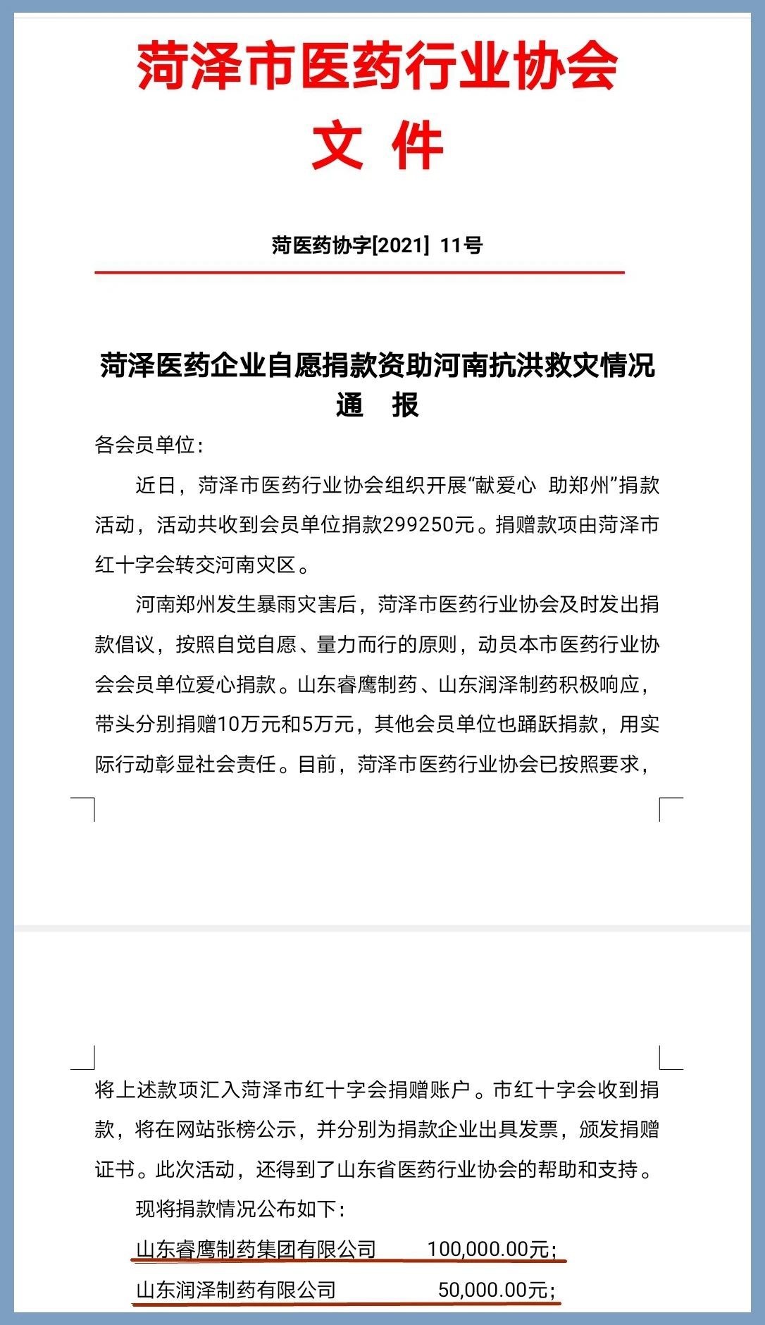 7月26日,睿鷹集團在接到通知后,積極參與捐款活動。分別以山東睿鷹制藥集團有限公司和山東潤澤制藥有限公司的名義分別向菏澤市醫(yī)藥行業(yè)協(xié)會捐款10萬元和5萬元, 希望能夠幫助鄭州人民盡快戰(zhàn)勝暴雨及次生災害,愿鄭州人民早日恢復幸福安寧生活。