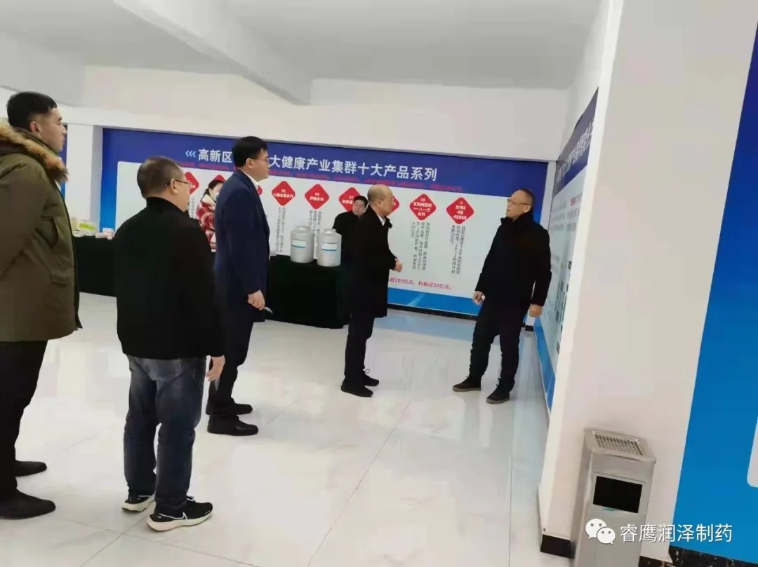 2022年1月15日,山東互聯網醫保大健康集團有限公司董事長廖遠杰一行蒞臨菏澤市高新區了未元大健康產業園深入開展考察、調研工作,菏澤市委常委、常務副市長王磊,菏澤市政府黨組成員、高新區黨工委書記郭保存,睿鷹集團總裁彭繼先,了未元制藥總經理周大錚,睿鷹集團總裁助理曾凡洪陪同調研。 在中藥“一人一方”智能制造車間展廳,彭總向廖遠杰董事長一行詳細介紹了睿鷹集團產業轉型升級、了未元大健康產業布局、中醫藥“一人一方”遠景規劃、生物醫藥全產業鏈智能制造共享平臺打造、一致性評價產品過評、新藥研發及人才引進及隊伍建設等情況,并陪同廖董一行進入車間實地參觀車間建設、運營情況。