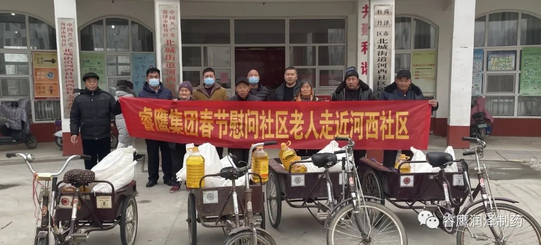 隨后,向社區老人們發放了面粉300余袋和食用油300余桶。 通過與老人們面對面、心貼心的慰問,老人們充分感受到來自睿鷹集團的深切關懷,感受到來自社區大家庭的溫暖。社區老人們由衷地感謝彭總和廣大睿鷹人的關心與關懷,并衷心祝愿睿鷹制藥集團越來越強盛、越走越輝煌! 山東睿鷹制藥集團作為一家有愛心的民營企業,自建廠以來便始終秉持“關愛社區老人生活,每逢佳節為老人送去生活用品,向老人們奉上濃濃關愛和真情祝?!钡钠髽I文化理念。在這一愛心活動的帶動和感召下,企業內部和周邊形成了一種“敬老、助老、愛老”的良好氛圍。據統計,截止目前我集團連續慰問社區老人31年,累計金額近120余萬元,以實際行動踐行了企業的社會責任。