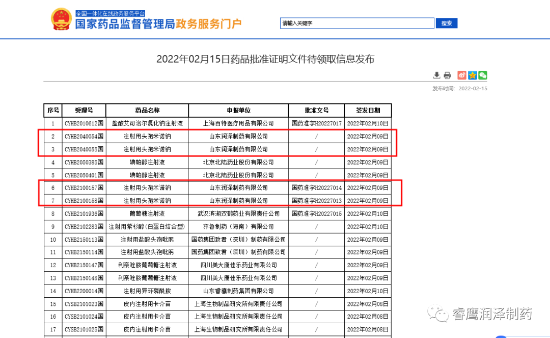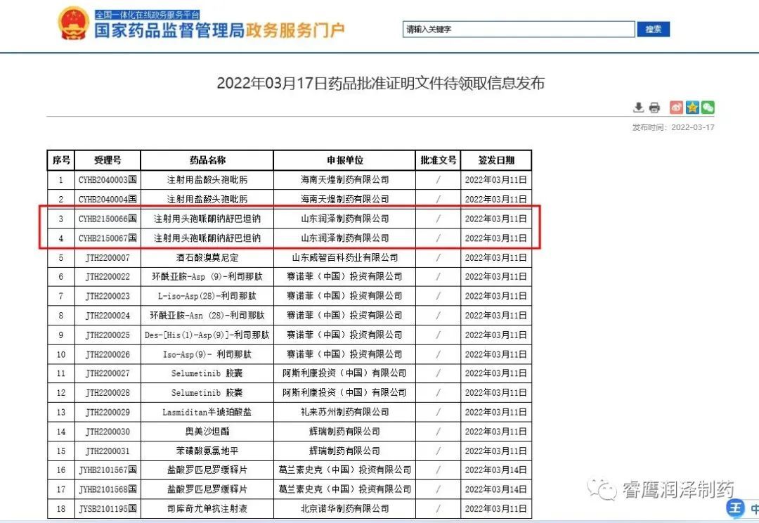 2022年3月17日,據(jù)國家藥品監(jiān)督管理局政務(wù)服務(wù)門戶網(wǎng)站公示,我集團(tuán)子公司山東潤澤制藥有限公司的注射用頭孢哌酮鈉舒巴坦鈉通過一致性評價,系全國首家。