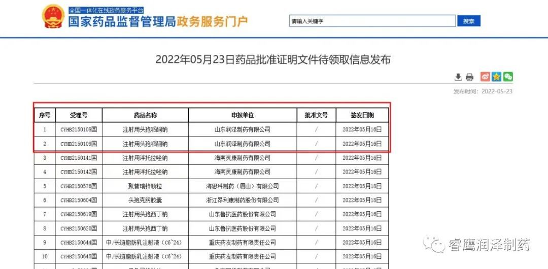據2022年5月23日國家藥品監督管理局政務服務門戶網站公示,我集團子公司山東潤澤制藥有限公司申報的注射用頭孢哌酮鈉通過一致性評價,系全國首家。