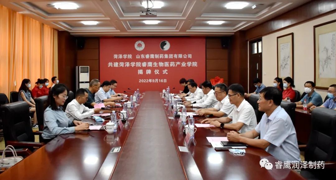 9月16日上午,菏澤學院睿鷹生物醫藥產業學院揭牌儀式在菏澤學院第一會議室舉行。菏澤學院黨委書記衣玉琛,黨委委員、副院長孟令美、胡尊東,睿鷹集團總裁彭繼先,集團常務副總裁、睿鷹公司總經理尚中棟,集團了未元中醫藥研究院總經理吳漢濤出席活動,揭牌儀式由胡尊東主持。