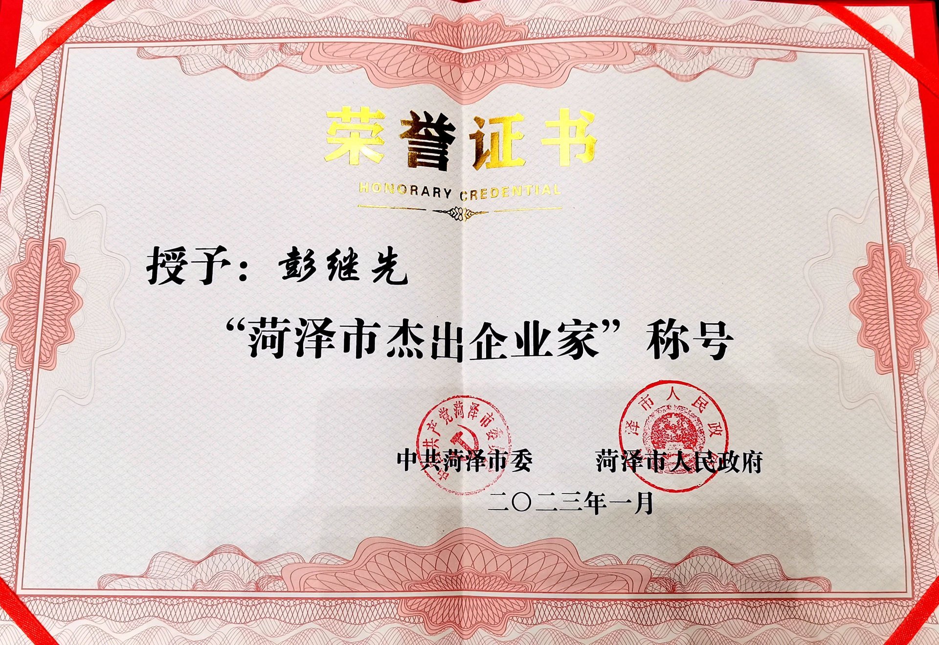 1月28日,全市企業家隊伍建設暨菏澤市杰出企業家頒獎大會舉行。市委書記張新文講話并頒獎,市委副書記、市長張倫主持,市人大常委會主任王磊,市政協主席王衛東,市委副書記李春英出席。會上,市委、市政府授予彭總等五位企業家“菏澤市杰出企業家”稱號,并記個人二等功一次。在熱烈的掌聲中,張新文書記為彭總頒獎。