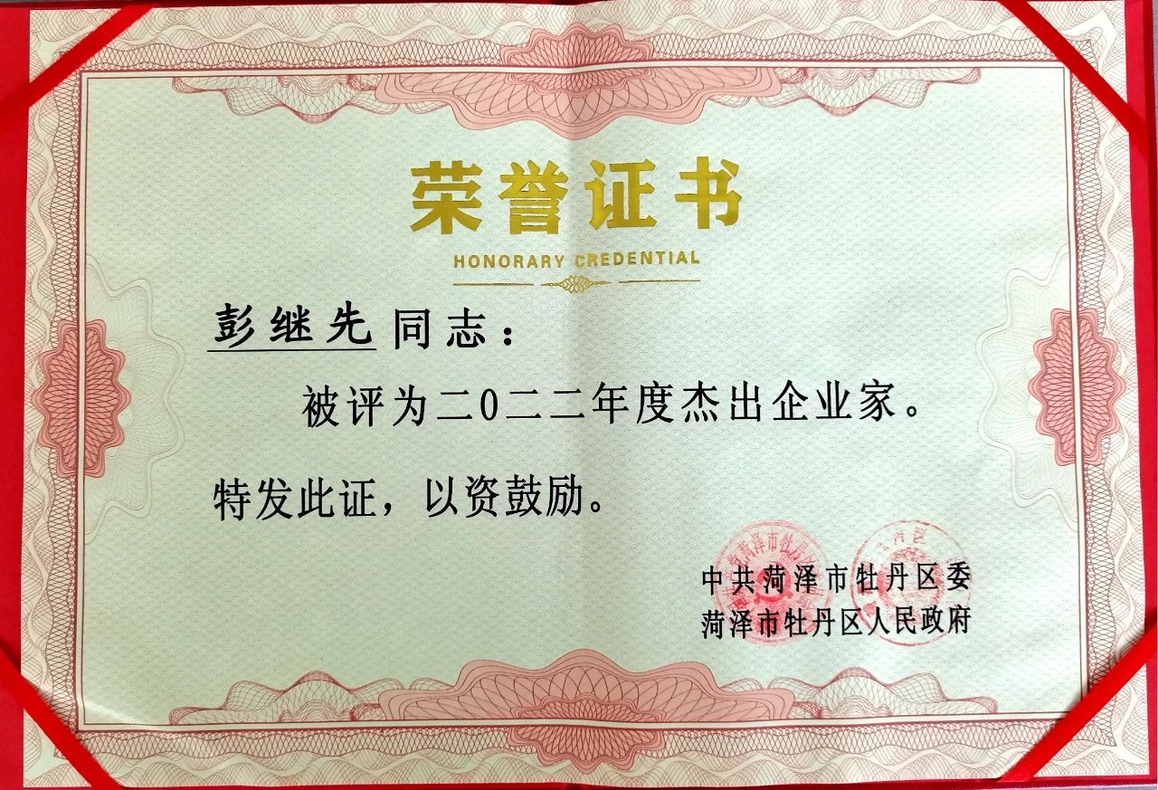 菏澤市商務(wù)局局長尹慧萍為彭總頒發(fā)杰出企業(yè)家榮譽證書