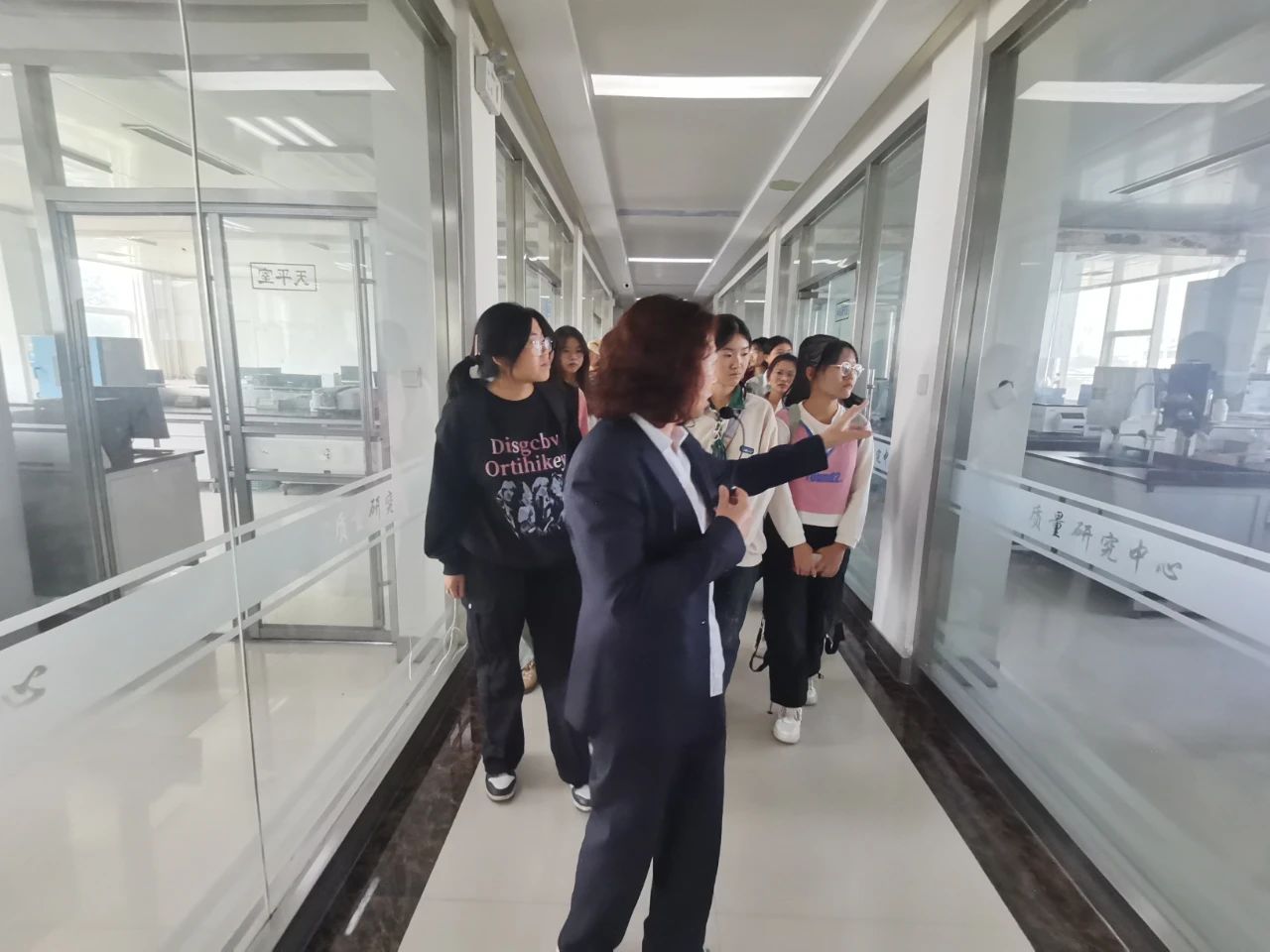 在潤澤公司的質檢中心,潤澤副總經理、質量總監高偉霞帶領廣大師生進行參觀。她介紹了潤澤質檢中心所承擔的重要職責和任務,質檢中心的結構布局和質檢項目。她從非常專業的角度給廣大師生們解讀了各檢測項目的必要性以及潤澤公司檢測儀器和手段的前沿性。同時,她要求同學們在大學期間一定要切實學好新知識、掌握真本領,做一個有知識、懂技術、會創新的有用之才!