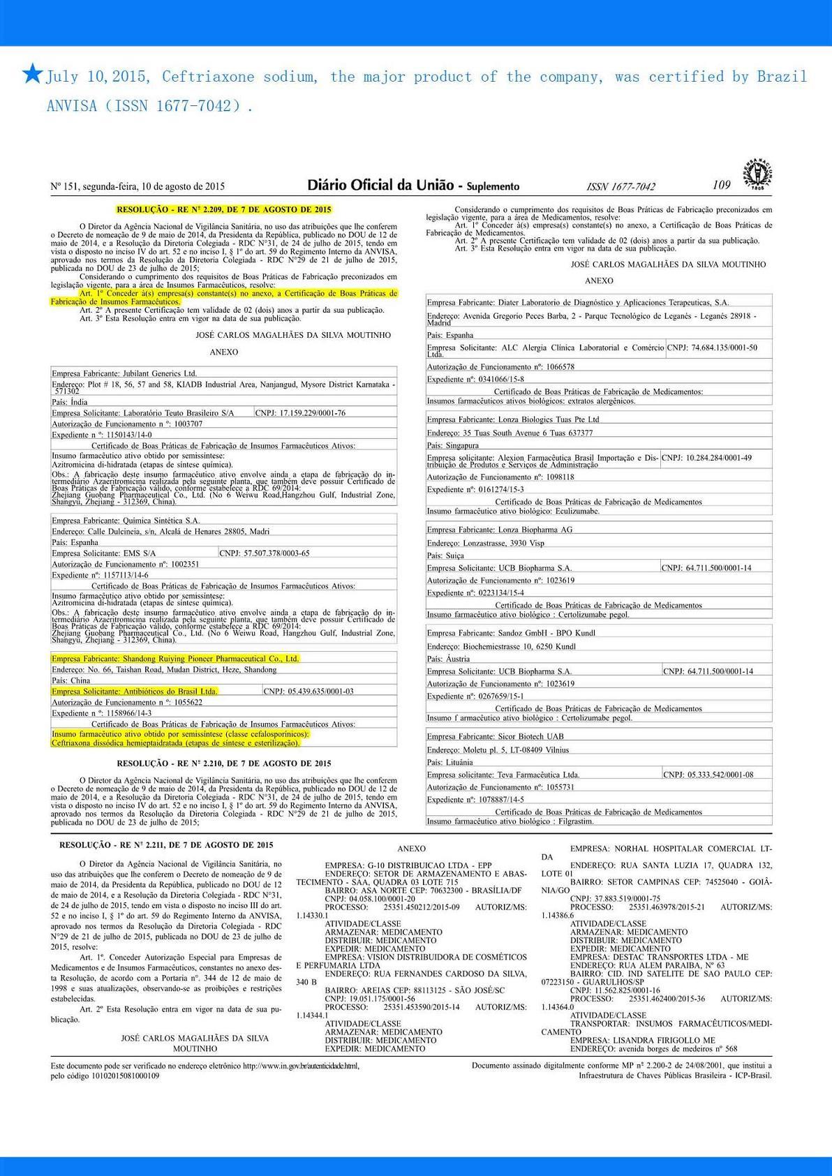 Ceftriaxone sodium, the major product of the company, was certified by Brazil ANVISA